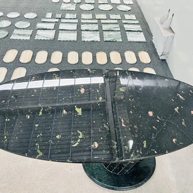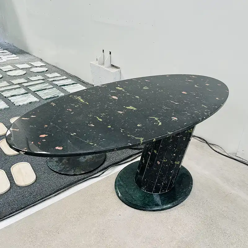 Gröna marmor matbord i ovala, runda matbord, rektangulära matbord och skräddarsydda geometriska former är de senaste trenderna. Denna gröna marmor matbord oval är mycket efterfrågad på grund av dess stil såväl som funktionalitet.