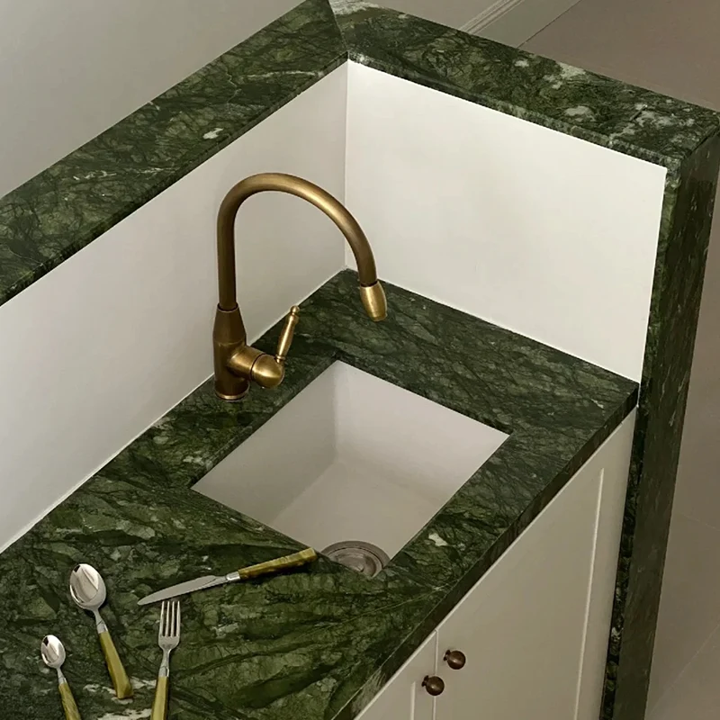 Ming Green marmorbänkskivor ger en rik men återupplivande utseende för kök. Denna marmor kompletterar fint med vita, gråa och träskåp, som anger elegansen och värmen i köket.